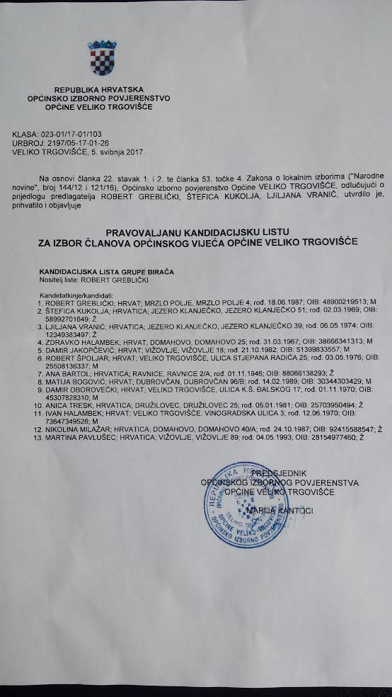 NEZAVISNA LISTA U OPĆINSKOM VIJEĆU NOSITELJ LISTE ROBERT GREBLIČKI